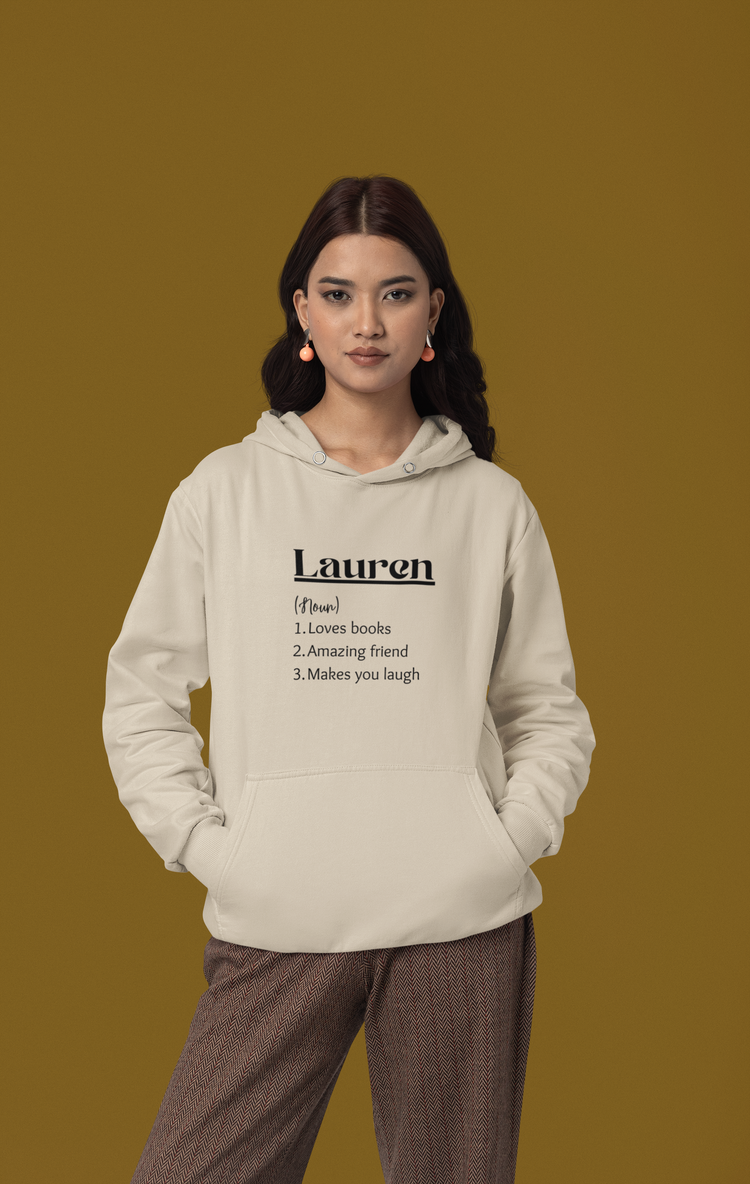 This hoodie features a unique design that displays the meaning of your name. Stay warm and stylish while proudly expressing your identity. Made with high-quality materials, this hoodie is perfect for everyday wear. Show off your individuality with the Name Definition Hoodie.